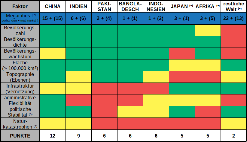 Wie schon in den vorhergehenden Beiträgen angeklungen ist, sehe ich die Realisierbarkeit von GIGACITIES im Südlichen Asien als kompliziert an. Für das Potential scheint die reine Einwohnerzahl wie in China zunächst ein guter Indikator zu sein. Jedoch machen viele andere Faktoren wie Infrastruktur, politisch-administrative Flexibilität oder auch Auswirkungen durch Naturkatastrophen letzten Endes die Errichtung einer GIGACITY in den bevölkerungsreichen Regionen des Südlichen Asien sehr schwierig (Siehe Tabelle). In Indien lägen die Bedingungen für GIGACITIES dabei noch am günstigsten [1].