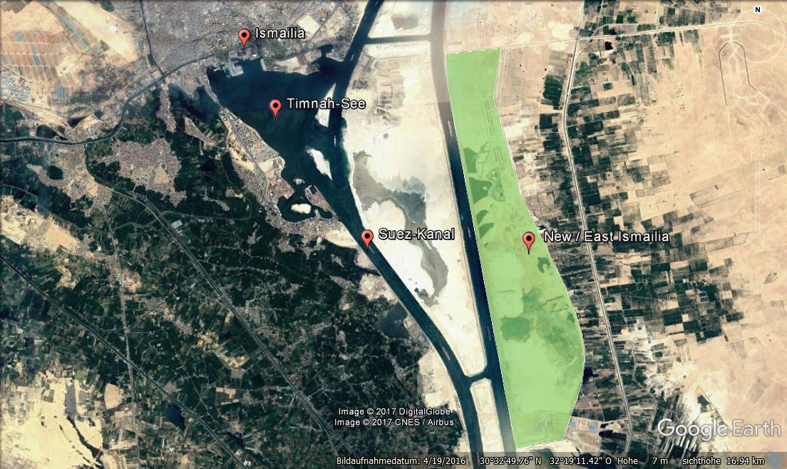 New Ismailia (bzw. East Ismailia) östlich des (neuen) Suez-Kanals in der Entstehung (© 2017 Google Earth, Kartendaten: DigitalGlobe und CNES / Airbus)