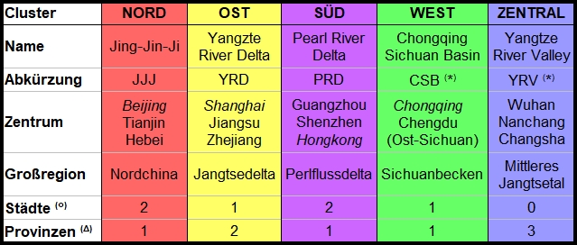 ° Dabei handelt es sich entweder um die vier Regierungsunmittelbaren Städte oder um die zwei Sonderwirtschaftszonen Chinas im Fall des Süd-Clusters. Deren Namen sind in der vorliegenden Tabelle kursiv geschrieben.