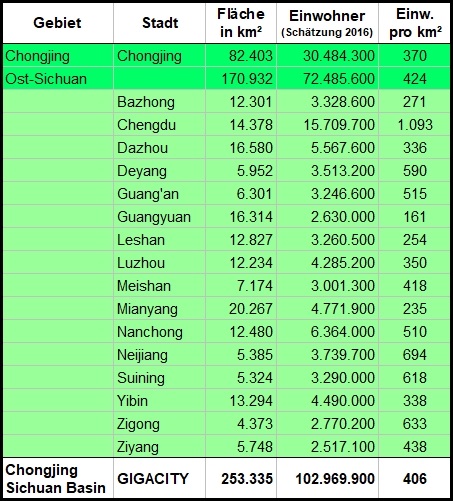 Kerndaten der Gebiete einer möglichen GIGACITY im Chongjing Sichuan Basin (eigener Entwurf)