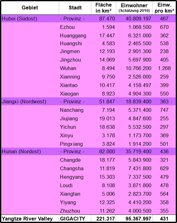 [1] Darunter sind die jeweiligen Provinzhauptstädte Wuhan, Changsha und Nanchang, wobei lediglich Wuhan mit über 10 Millionen Einwohnern bereits eine Megacity ist. Trotz zahlreicher Millionenstädte wäre YRV mit knapp 95 Millionen Menschen die einwohnerschwächste GIGACITY.