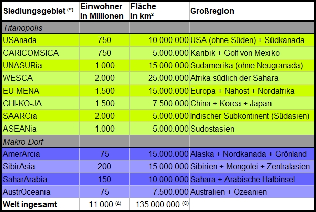 Die Kerndaten der hypothetischen „Titanopolis“ und „Makro-Dörfer“ auf Basis der errechneten Bevölkerungszahlen der UNO für das Jahr 2100 (eigener Entwurf)