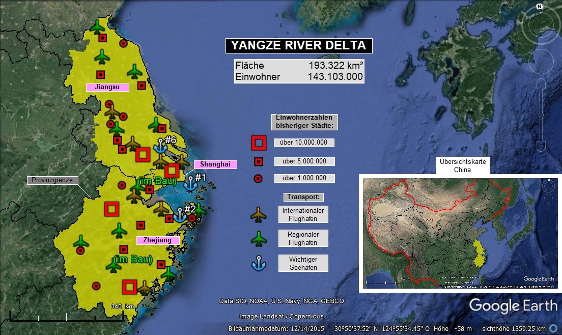 Die GIGACITY am Yangtze River Delta (YRD) wird sich voraussichtlich aus den zwei Provinzen Jiangsu und Zhejiang sowie der regierungsunmittelbaren Stadt Shanghai zusammensetzen [1]. Damit hätte die neue GIGACITY mit fast 900 km eine sehr langgezogene Nord-Süd-Ausrichtung und daher eine lange Küste mit zahlreichen Häfen. Der Hafen von Shanghai (#1) ist dabei nicht nur der bedeutendste und größte Chinas sondern der gesamten Welt [2]. Zwei weitere Seehäfen aus Chinas TOP 10 liegen ebenfalls in der Region (Ningbo-Zhoushan #2 und Suzhou #6).