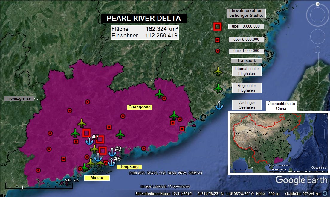 Die mögliche Ausdehnung der GIGACITY am Perlflussdelta (© 2017 Google Earth, Karten: Landsat/Copernicus, Daten: SIO, NOAA, U.S. Navy NGA, GEBCO, Beschriftung: eigener Entwurf)