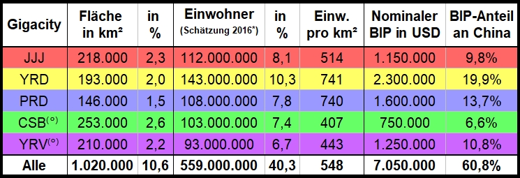 Mögliche Eckdaten der bisher geplanten GIGACITIES. Die Tabelle ist nur eine grobe Übertragung der Pläne an die gestehenden administrativen Gegebenheiten (eigener Entwurf, Datenquelle Thomas Brinkhoff: City Population, China / CC BY 3.0)
