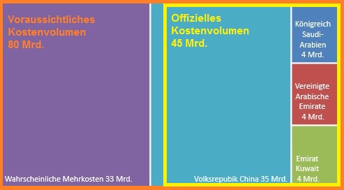 Das Gesamtvolumen der Kosten wurde von offizieller Seite mit 45 Mrd. US-Dollar angegeben. Für die Finanzierung des Projektes haben die teilnehmenden Golfstaaten Kuwait, Saudi-Arabien und die Vereinigten Arabischen Emirate jeweils 4 Mrd. US-Dollar zugesichert. Auch China wird sich über zwei staatliche Firmen mit rund 35 Mrd. US-Dollar an der Realisierung beteiligen [1]. Die endgültige Summe des Projekts wird wahrscheinlich eher bei rund 80 Mrd. US-Dollar liegen. Zunächst wurde eine Bauzeit von sieben Jahren veranschlagt, später wurde diese auf zwölf Jahre erhöht.