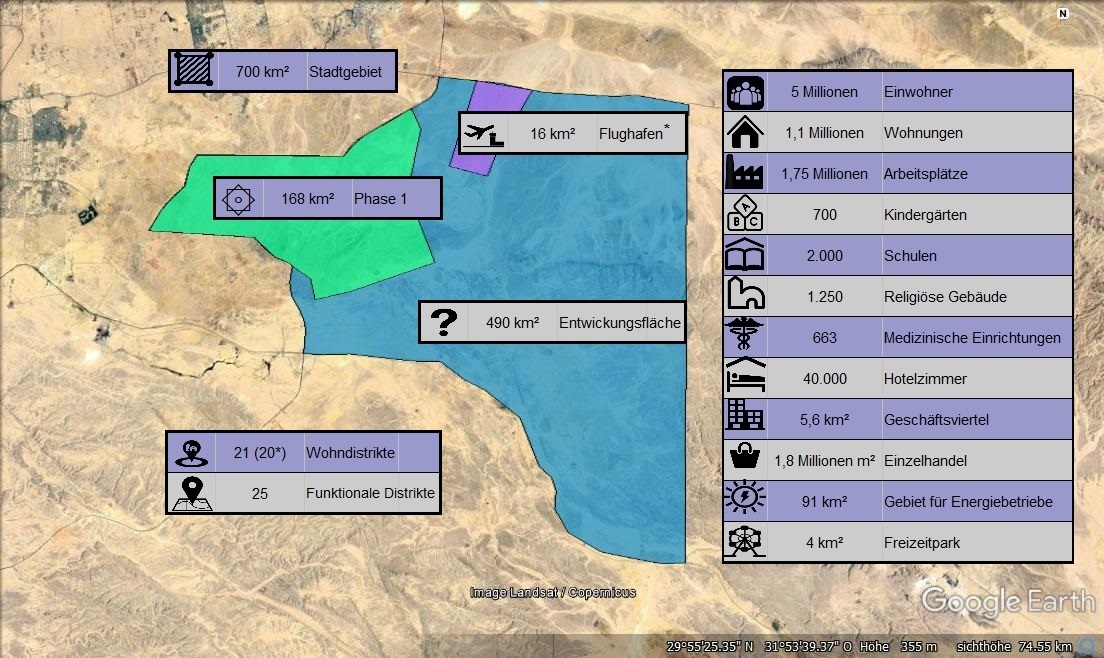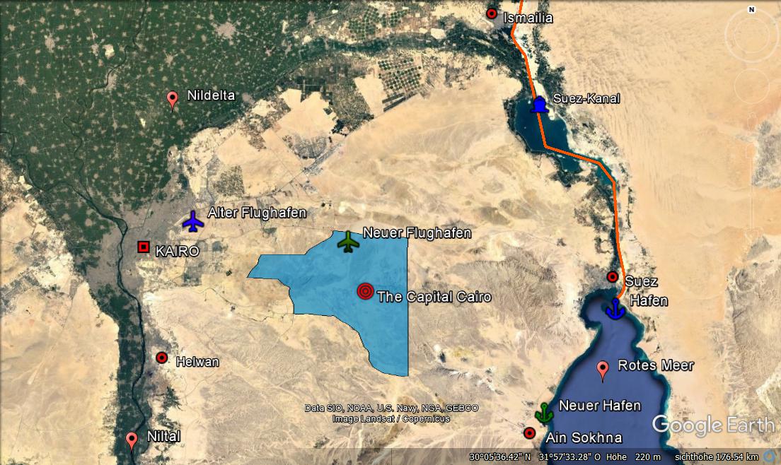 Der alte Flughafen von Kario ist ca. 30 km in westlicher Richtung vom neuen Stadtzentrum entfernt (blaues Flugzeug in der Karte). Der zur Zeit gebaute neue Flughafen wird im Norden des Stadtgebietes liegen (grünes Flugzeug) [1]. Er ist aber mit 16 km² nur etwa halb so groß wie sein Vorgänger [2]. Es ist meiner Meinung nach nicht anzunehmen, dass der neue Flughafen den alten als Hauptverkehrsflughafen für ganz Ägypten ablöst [3].