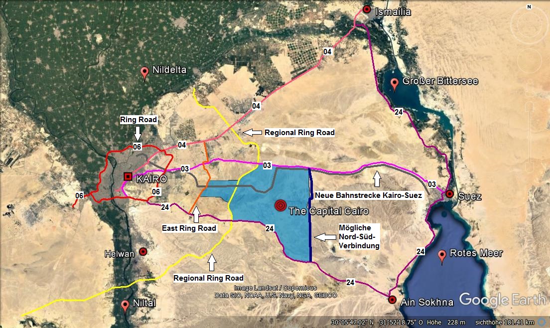 The Capital Cairo liegt auf halber Strecke zwischen Kairo und Suez [1]. Mehrere Hauptverkehrsachsen verbinden Kairo mit dem Suez-Kanal bzw. dem Roten Meer. Die nördliche wird vom Highway 04 gebildet und führt nach Ismailia (rosa). Der Highway 03 wiederum bildet die mittlere Achse nach Suez (pink). Die südliche Verkehrsachse verläuft schließlich von Kairo über Ain Sokhna am Roten Meer und von dort aus weiter nach Norden über Suez nach Ismaila (violett) [2]. Die neue Hauptstadt befindet sich zwischen den beiden letztgenannten Achsen (Karte).