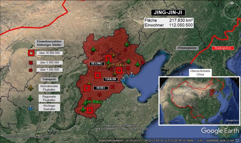 JING-JIN-JI wird die beiden benachbarten regierungsunmittelbaren Städte Beijing (Peking) und Tianjin sowie die umliegende Provinz Hebei umfassen. Der Name setzt sich dabei aus den (chinesischen) Endungen der beiden Städte („Jing“ & „Jin“) und der historischen Bezeichnung für die Provinz Hebei („Ji“) zusammen. Diese Region ist der politische Kern der heutigen Volksrepublik China und die Umwandlung zu einer GIGACITY würde diesen Aspekt sehr wahrscheinlich nochmals verstärken [1].