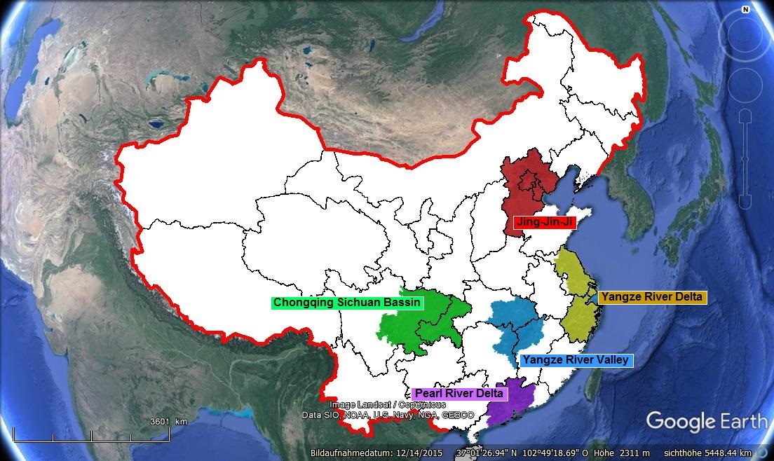 Im Jahr 2014 wurde von der chinesischen Regierung erstmals die Errichtung von 5 GIGACITIES und eine Auflistung von 15 potentiellen Kandidaten bekannt gegeben [1]. Dabei handelt es sich zunächst einmal vordergründig „nur“ um eine rein administrative Zusammenlegung von bereits stark verstädterten Regionen innerhalb der Volksrepublik China. Die jeweiligen Siedlungscluster sind im wahrsten Sinne des Wortes in alle Himmelsrichtungen des Landes verteilt (Siehe Karte) [2].